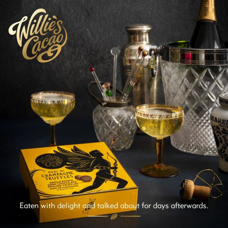 WILLIE'S CACAO CHAMPAGNE TRUFFLES — Deep, dark and decadent. Soft, nutty, single estate dark chocolate gently entwines with smooth Marc de Champagne and freshly roasted hazelnuts. 100% Natural. Vegan. Soya Free. Gluten Free. Direct Trade.