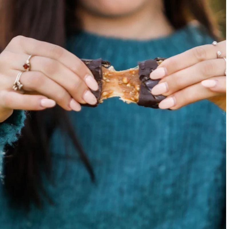 Think classic caramel-choc bar energy — but saltier, deeper, and far more satisfying. Sweet meets salty, chewy meets melt, crunch meets pull. The kind of bar you eat slower than planned… then suddenly it’s gone.